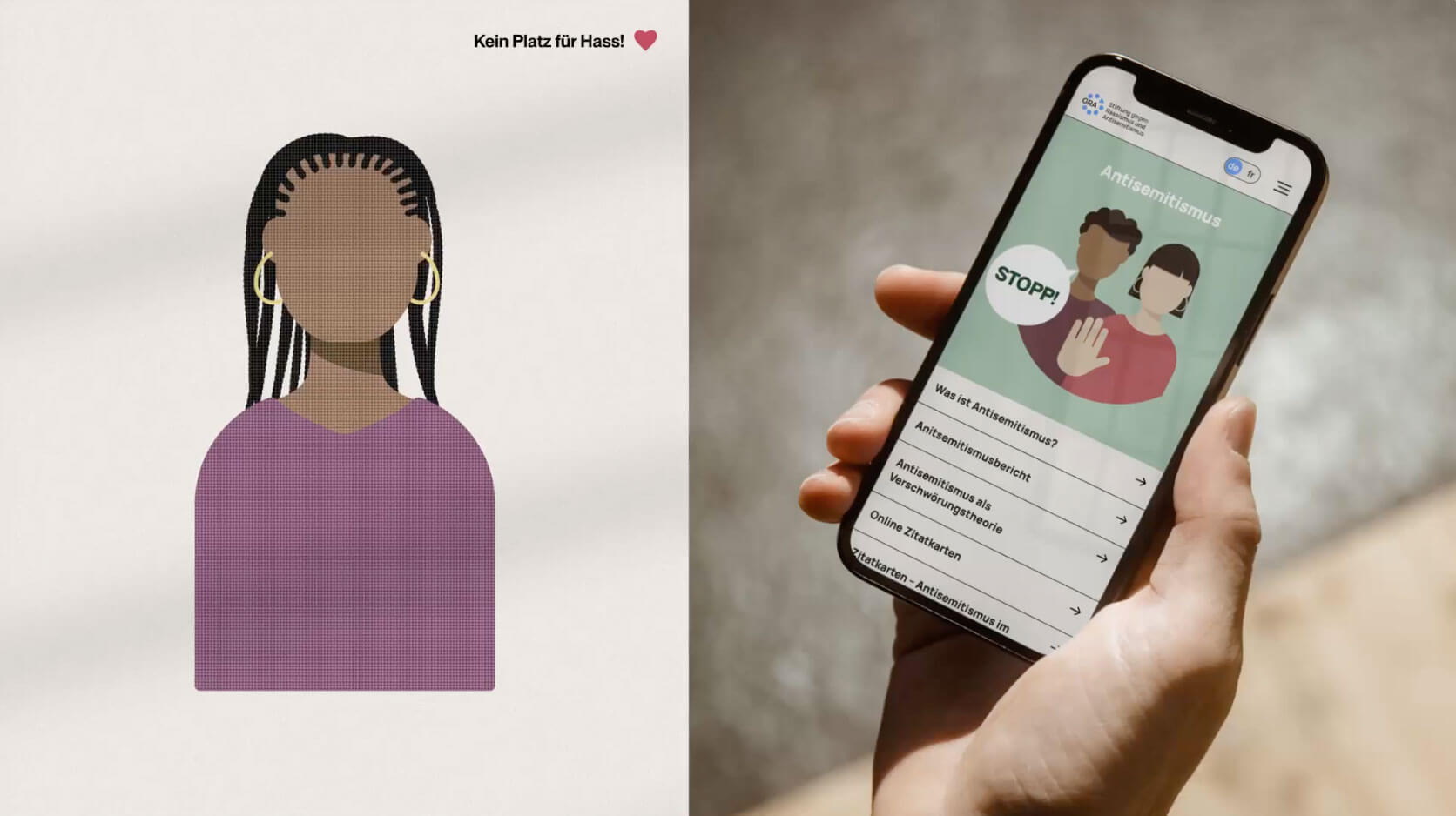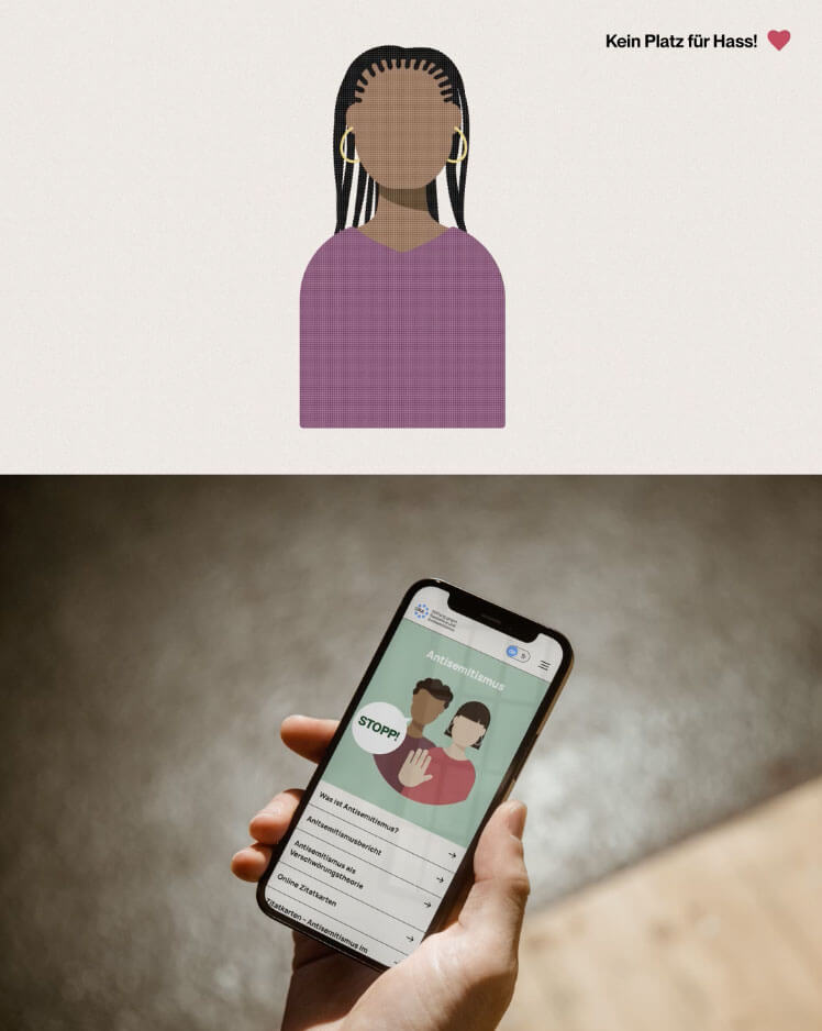 Textliche Informationen sowie eine klare Botschaft gegen Rassismus und Antisemitismus sind die Grundbausteine des Brandings. Um das Gelesene bzw. die Werte dahinter besser aufnehmen zu können, werden Informationen in ausreichend Leerraum platziert. Klar strukturierte Linien sorgen für Halt und symbolisieren ein Gefühl von Sicherheit und Zusammenhalt.